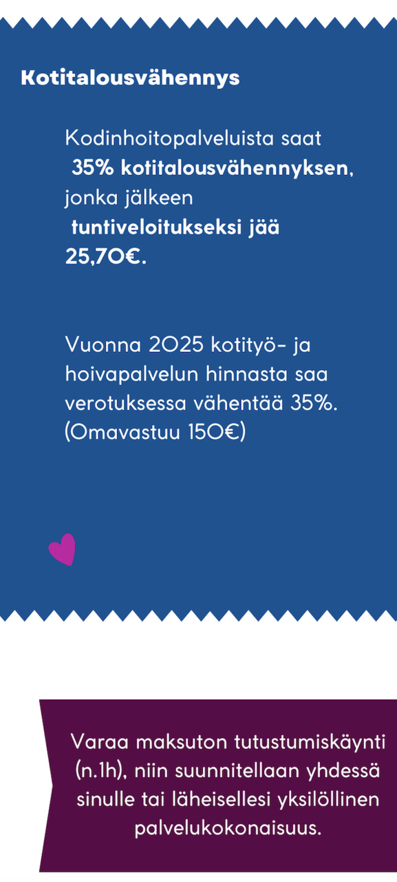 * Asiakas voi hakea palveluistamme kotitalousvähennyksen.