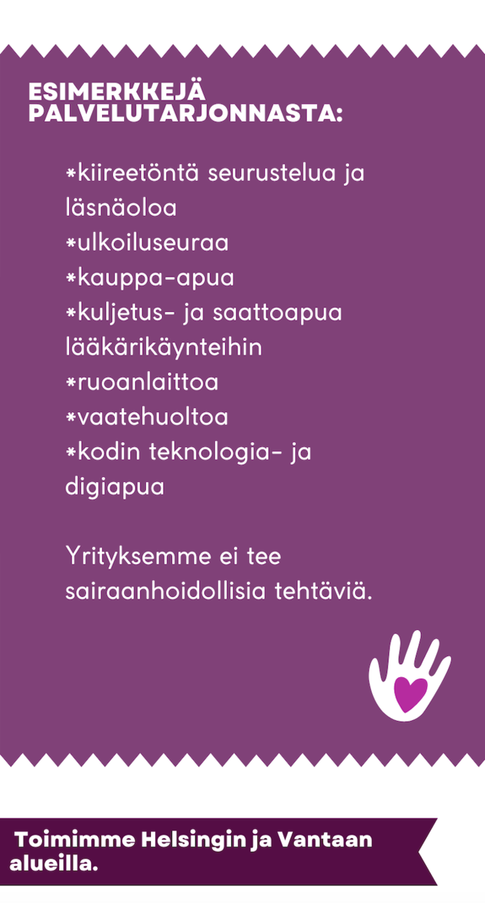 * Toimintamme on valvottua ja olemme hyväksytty yksityisten sosiaalipalveluiden tuottajaksi Helsingissä ja Vantaalla.
